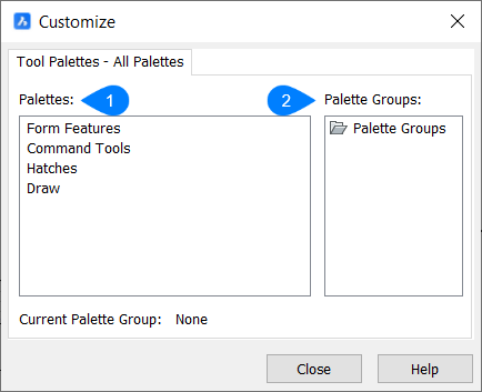 ツールパレットパネルで使用できるすべてのパレットの一覧を表示します。パレットのいずれかを右クリックすると、コンテキストメニューにいくつかのオプションが表示されます。