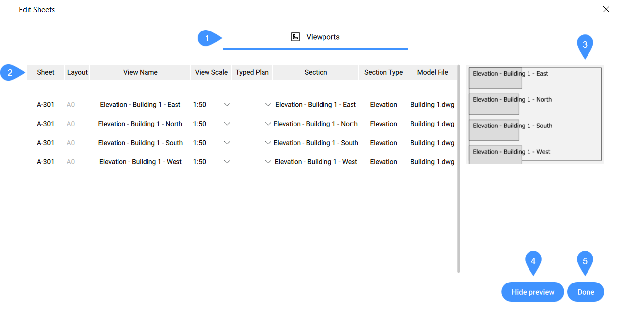 - シート名を表示します。 注: ビューポートタブで名前の変更はできません。名前の変更は、BIMプロジェクトブラウザパネルのシートタブのプロパティセクションで行えます。