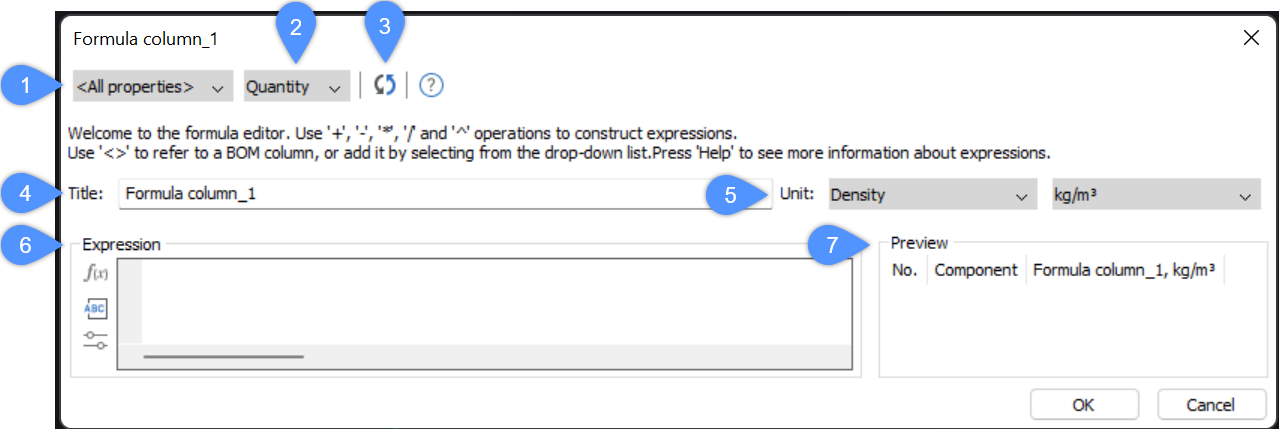 数式列ダイアログボックスでは、計算式列のタイトル、単位、および式を設定できます。また、計算式の結果のプレビューも表示されます。
