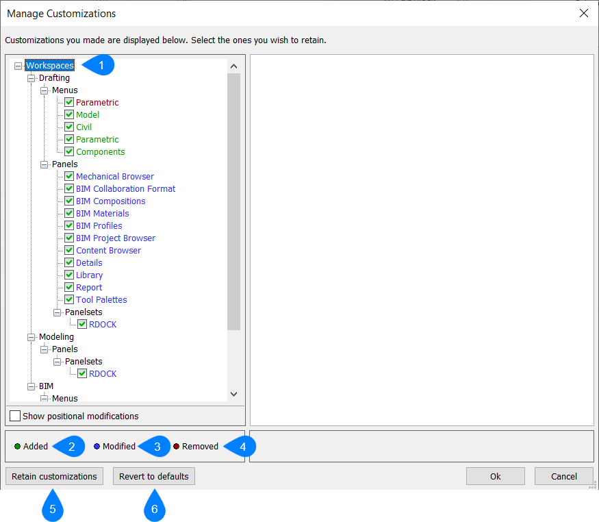 カスタマイズを管理ダイアログボックスでは、ユーザーインターフェースに加えられた変更を確認したり元に戻したりするための、すべてのカスタマイズのリストが表示されます。