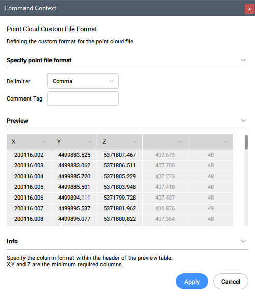 カスタムポイントファイル形式を使用して、データ構造が標準ではない点群ファイルの解析ができます。ただし、データは表形式であることが必要です。区切り文字およびコメントタグ(省略可能)を指定することにより、データの最初の数行が読み取られ、ダイアログボックスにプレビュー表示されます。次に、列ヘッダーを指定できます。最低限X、Y、Zを指定する必要があります(R、G、B、Iは省略可能です)。プロセスを高速化するために、最初に区切り文字と列形式が推定されます(可能な場合)。commentタグを使用するとコメント行を無視できます(たとえば、コメント行が#記号で始まる場合は#)。