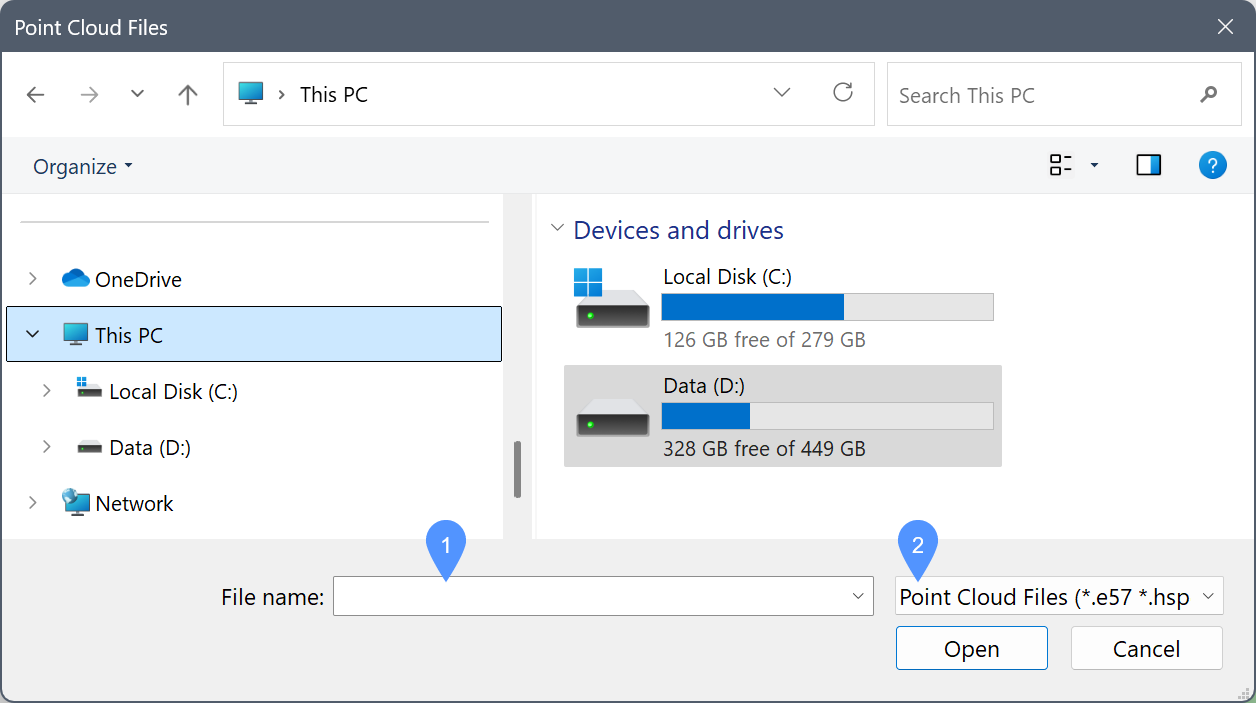 POINTCLOUDATTACHコマンドのファイルオプションを実行して開きます。