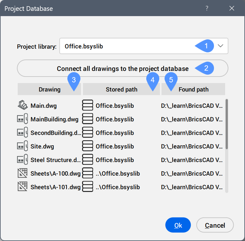 2. すべての図面をプロジェクトデータベースに接続: すべての図面をワンクリックでプロジェクトライブラリにリンクさせることができます (このライブラリを外部のBSYSLIBファイルとして設定)。