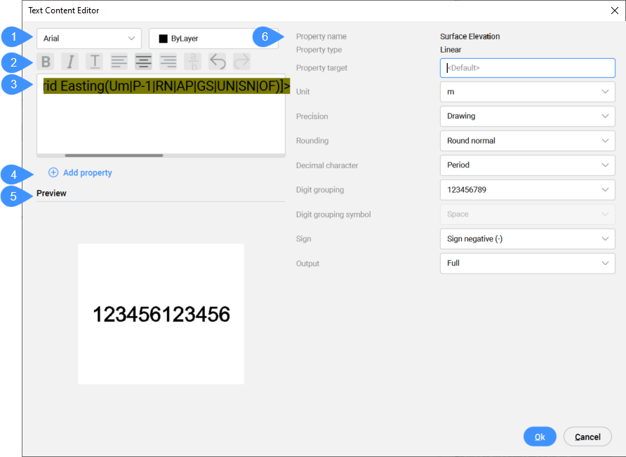 属性のプロパティを編集する場合は、文字コンテンツ編集ダイアログボックスの右側で編集するか、括弧内の略語を編集します。属性設定で行った変更は、テキストエディターで自動的に更新され、その逆も同様です。詳細については、土木ポイントのシンボルとラベルの理解の記事を参照してください。