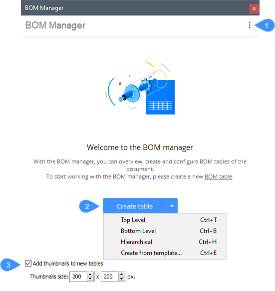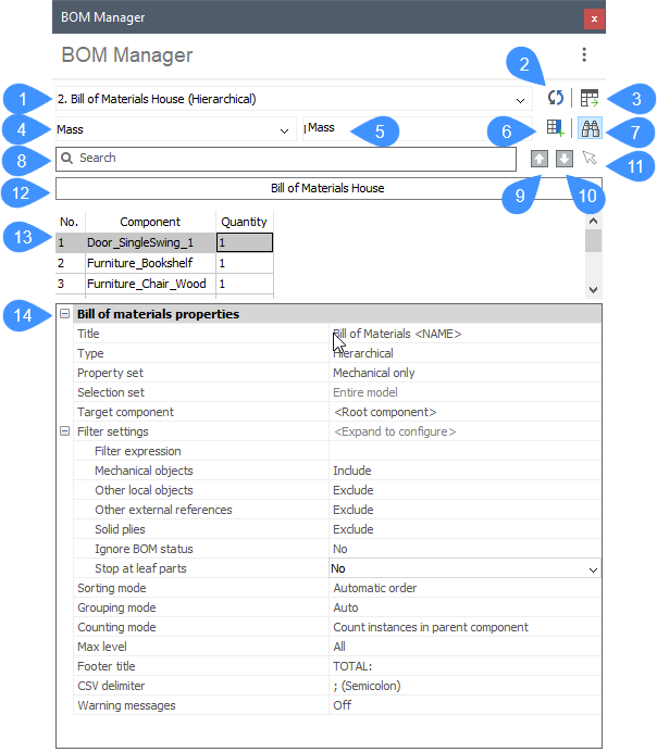 注: 部品表マネージャーを使用すると、部品表テーブルを任意のドキュメントに作成できます。メカニカルアセンブリやBIMモデルを含む必要はありません。その場合、フィルタ設定は自動的に調整され、すべてのブロック参照、外部参照、およびソリッドがモデル内に含まれます。