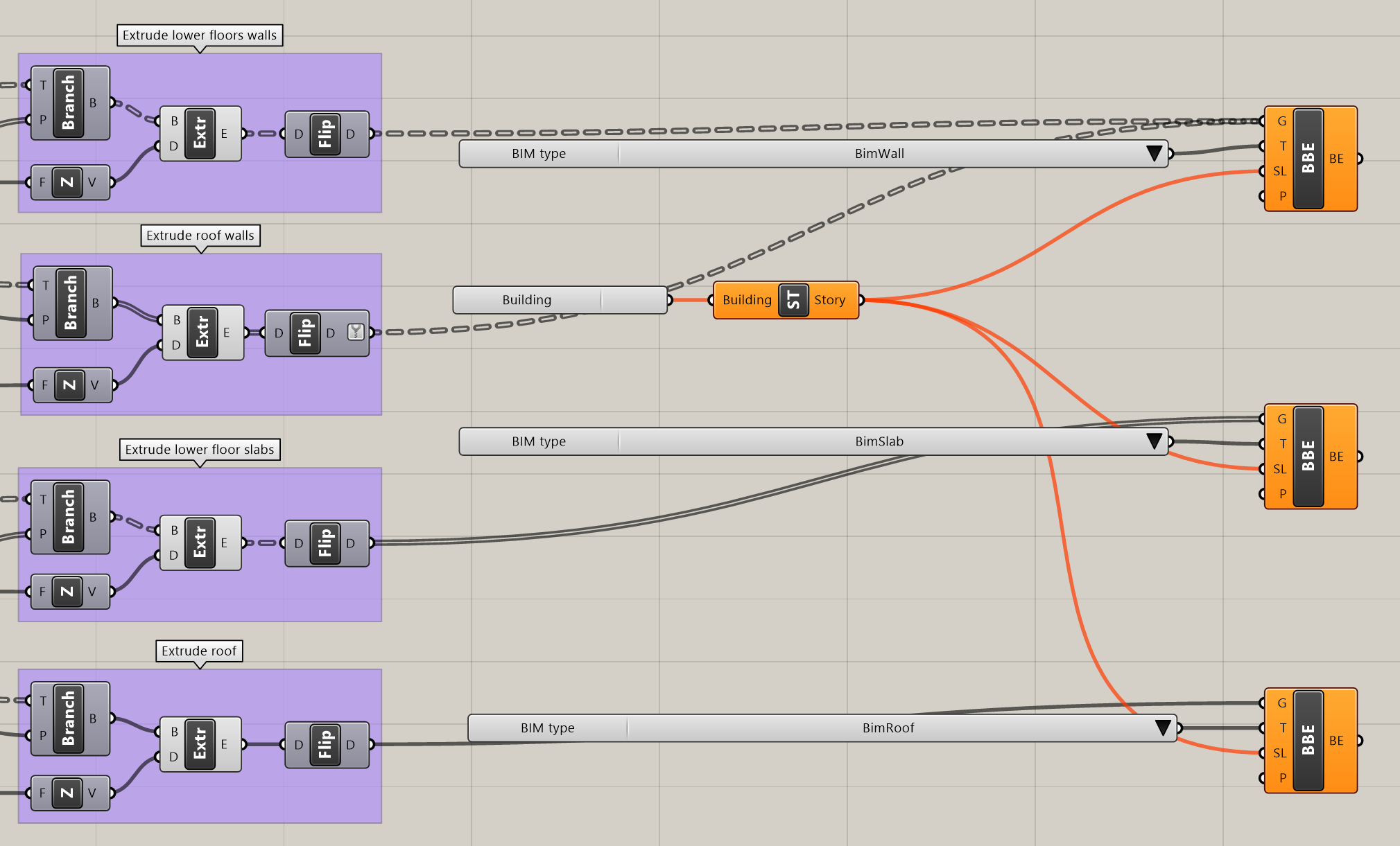 - Dołącz wytłaczane elementy (komponenty Flip) do węzłów wejściowych Geometry komponentów Bake Building Element: