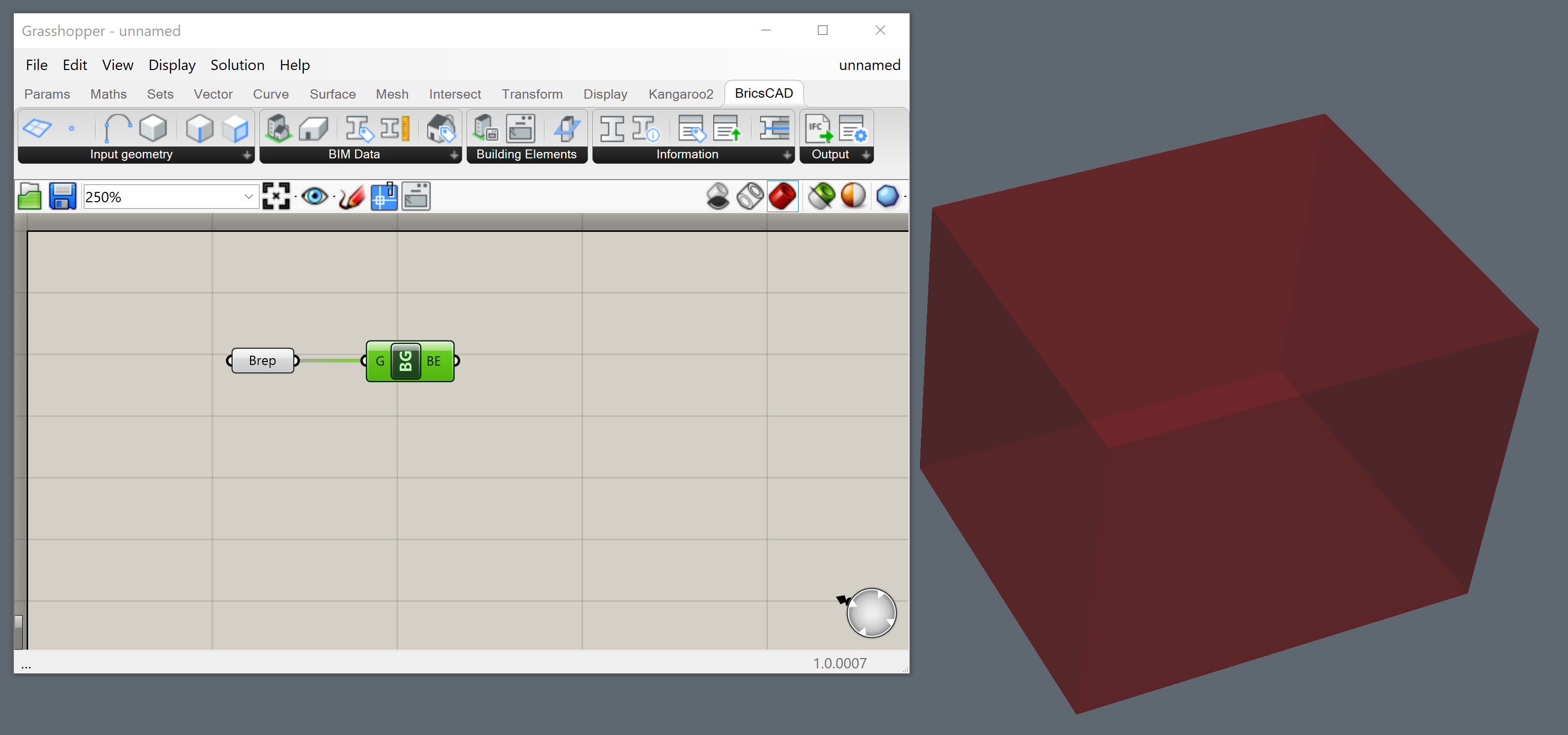 - Komponent Brep zmieni kolor z pomarańczowego na szary. Jeśli zamkniesz okno Rhino i powrócisz do okna Grasshopper, podgląd sześcianu zostanie wyświetlony w przestrzeni modelu BricsCAD.