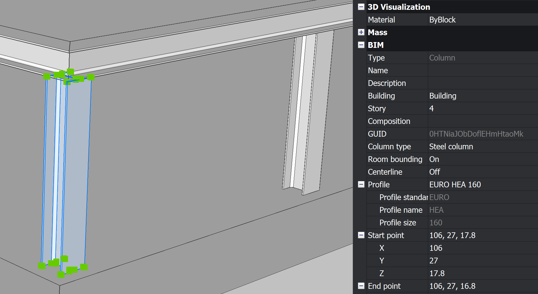 - Jeśli teraz wybierzesz kolumnę w BricsCAD i otworzysz jej Właściwości, ColumnType zostanie ustawiony na kolumnę stalową. Po zmianie wartości komponentu panelu, właściwości w BricsCAD zmieniają się w czasie rzeczywistym.