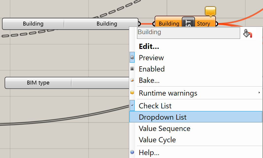 - Przejdź do Grasshoppera i kliknij prawym przyciskiem myszy komponent Budynki i umieść go na liście rozwijanej zamiast na liście wyboru.