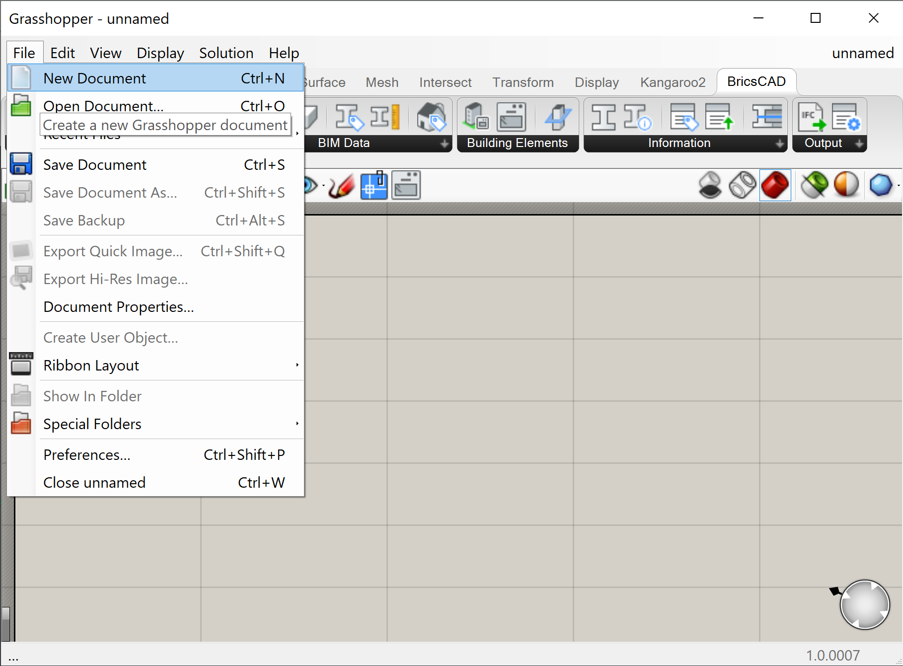 - W zakładce Plik programu Grasshopper wybierz Nowy dokument, aby otworzyć nowy i pusty skrypt Grasshopper.