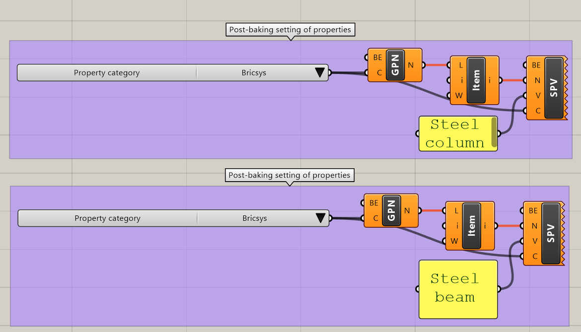 - Teraz połącz dane wyjściowe Building Element komponentów Bake Building Element z odpowiednimi danymi wejściowymi Building Element komponentów Get Properties Names.