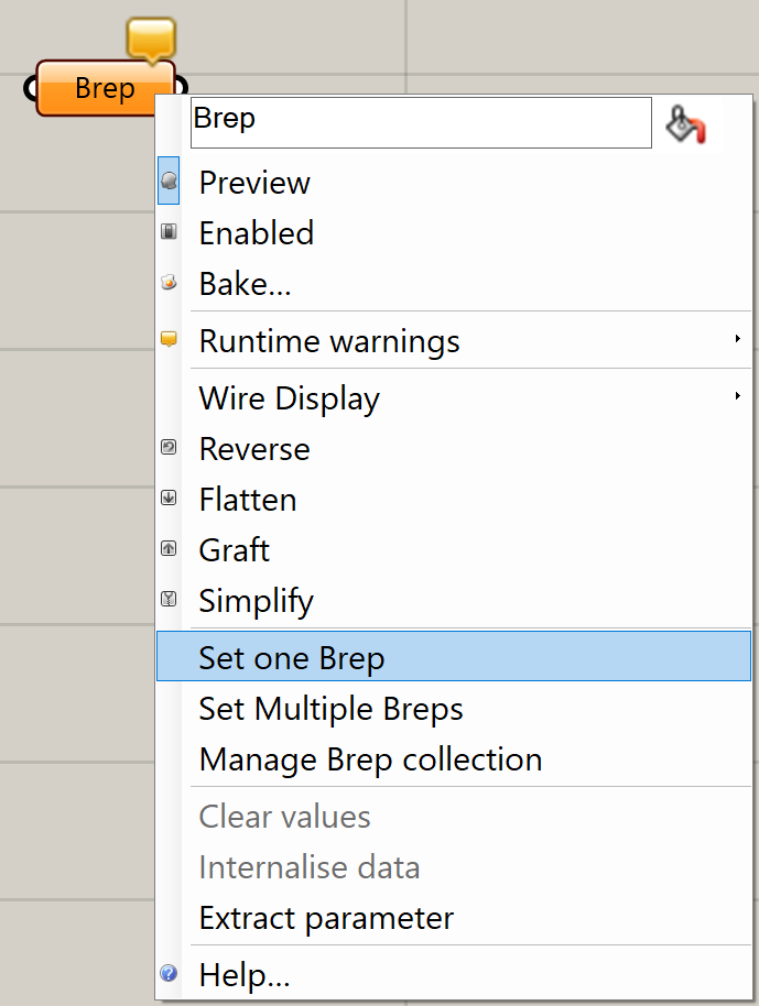 - Kliknij prawym przyciskiem myszy komponent i wybierz Set one Brep.