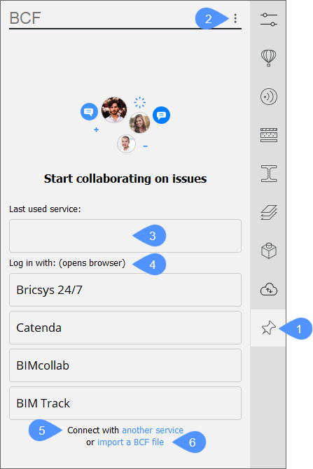 Panel wyświetla trzy najpopularniejsze usługi współpracy w chmurze (4), a także ostatnią używaną (3). Możesz bezpośrednio połączyć się z wybranym urządzeniem, klikając odpowiedni przycisk. Dostępne są również opcje połączenia z inną usługą (5) lub zaimportowania pliku BCF (6).