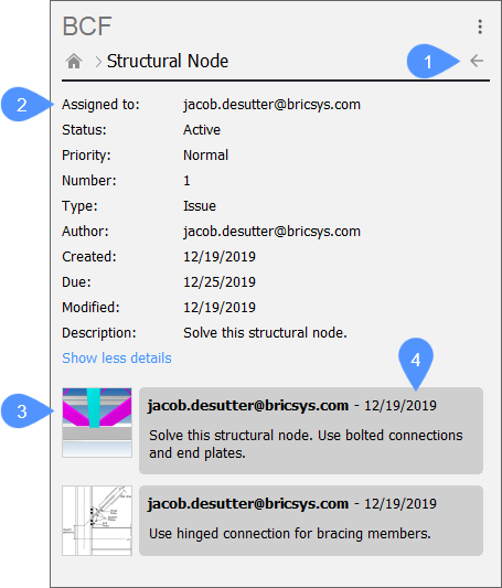 Kliknij problem, aby go otworzyć. Podczas otwierania problemu widoczny jest przycisk umożliwiający powrót do przeglądu problemu (1), bardziej szczegółowe informacje o problemie, takie jak status, data utworzenia itp. (2) oraz różne komentarze dotyczące tego problemu (4). Jeśli ten komentarz ma powiązaną pozycję kamery, kliknięcie miniatury obrazu (3) spowoduje przeniesienie kamery w bieżącym rysunku do tej pozycji. Jeśli do punktu widoku dołączone są elementy, są one podświetlane lub izolowane. Jest to przydatne, jeśli chcesz wiedzieć, gdzie dokładnie występuje problem i nie chcesz ręcznie przeszukiwać modelu.