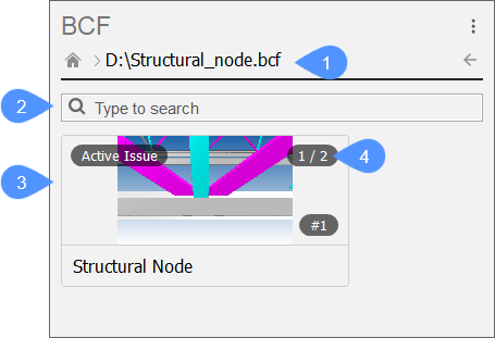 Zobaczysz ścieżkę do aktualnie otwartego pliku (1), pasek wyszukiwania, który może być użyty do filtrowania spraw (2) oraz listę spraw (3). W przypadku tego zaimportowanego pliku BCF istnieje tylko jeden problem z dwoma powiązanymi widokami (4).