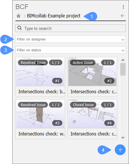 Kliknięcie projektu powoduje jego otwarcie i wyświetlenie listy problemów, podobnie jak miało to miejsce podczas importowania pliku BCF. W górnej części panelu wyświetlany jest bieżący projekt (1). Możliwe jest filtrowanie spraw według cesjonariusza (2) i statusu (3). Ułatwia to znalezienie odpowiednich kwestii. Możliwe jest również dodanie nowego numeru (4).