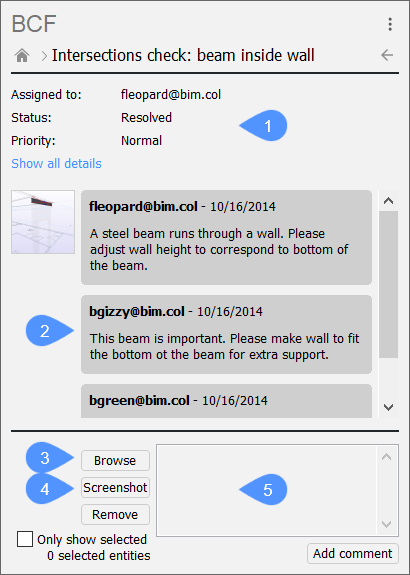 Kliknięcie sprawy powoduje jej otwarcie i wyświetlenie podobnych opcji jak poprzednio: szczegółowe informacje o sprawie (1) i komentarze dotyczące tej sprawy (2). Należy jednak pamiętać, że w dolnej części panelu można również dodać obrazy bitmapowe (3) lub zrzut ekranu z przestrzeni modelu (4). Można również dodać komentarze tekstowe (5).