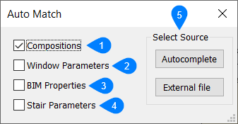 - Dopasowuje wszystkie wybrane opcje podmiotów w pliku zewnętrznym do podobnych podmiotów na otwartym rysunku.Uwaga: