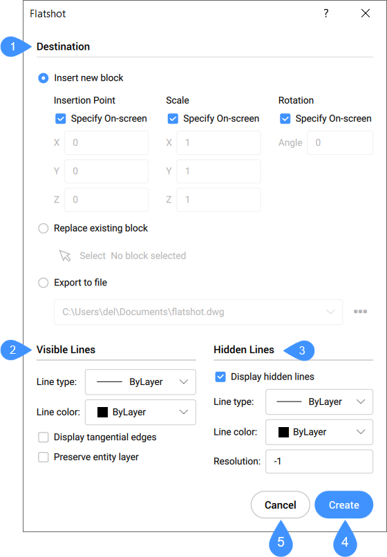 Okno dialogowe Rzut Płaski umożliwia tworzenie spłaszczonej, ukrytej liniowej reprezentacji brył 3D i powierzchni 3D jako bloku lub nowego rysunku.