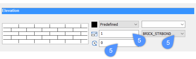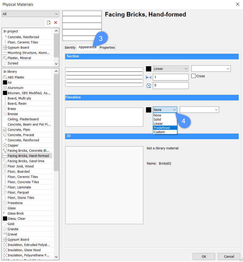 - Para configurar a textura ou o preenchimento sólido, acione a aba Aparência (3). A hachura de elevação é definida por padrão como Nenhuma. Clique no botão hachura de elevação e selecione o tipo de hachura: Nenhuma, Sólida, Linear, Pré-definido ou Personalizado (4).