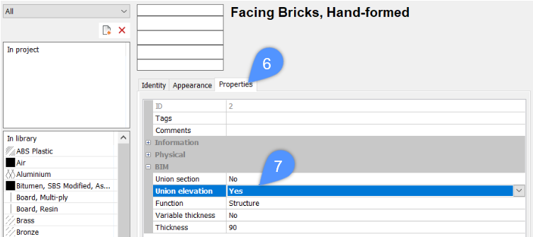 - Para remover linhas de conexão na elevação, entre diferentes sólidos do material, vá para a aba Propriedades (6) e defina a União na elevação para Sim (7).Nota: União na elevação funciona independentemente da configuração União no corte.