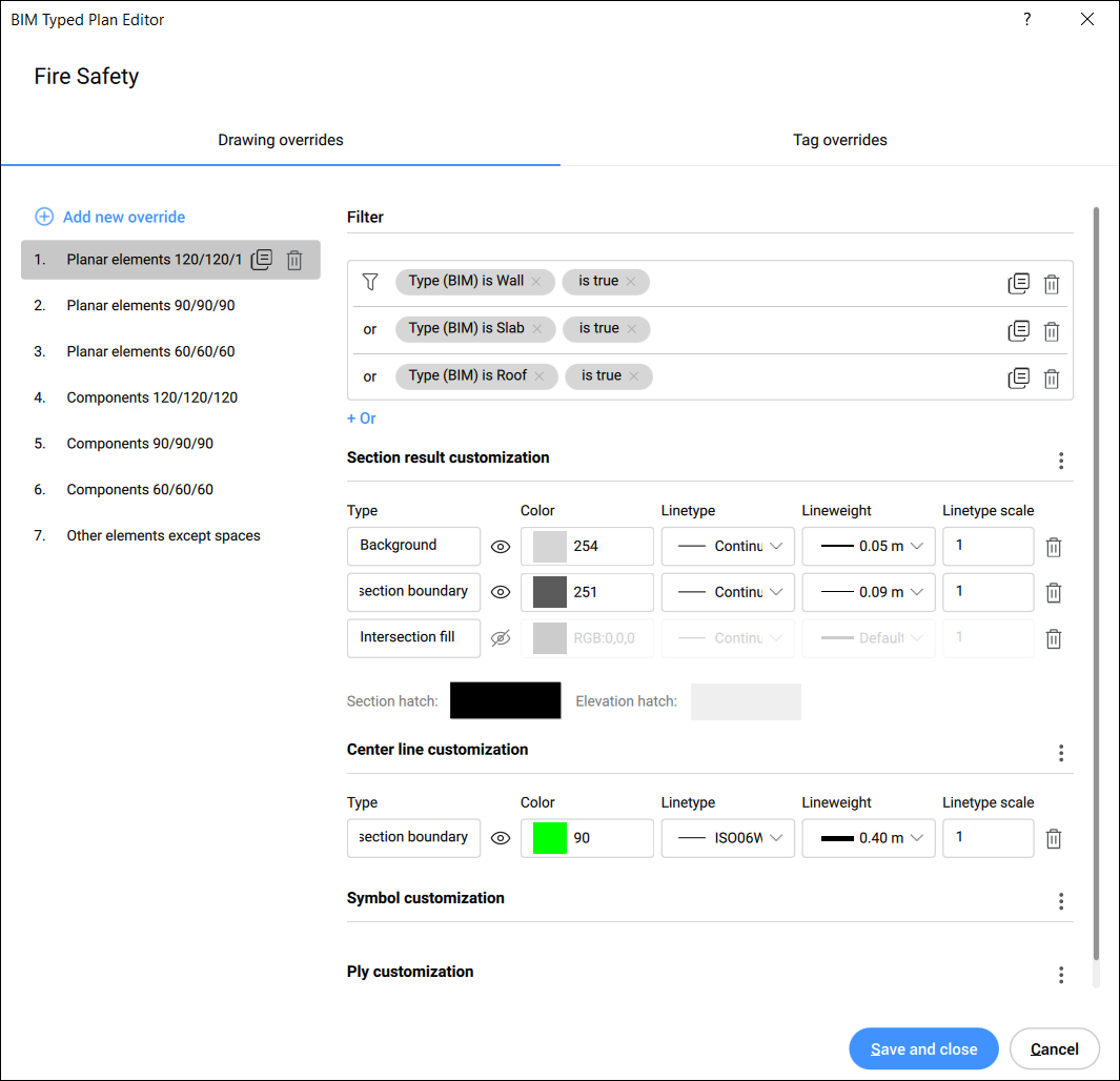 Existem 4 tipos diferentes de personalizações, que podem ser especificadas para cada grupo filtrado de elementos, separadamente. Você pode escolher como o elemento deve parecer como resultado de um corte, como uma representação do tipo linha de centro deve aparecer, como uma representação de símbolo externo deve substituir a entidade original, e você pode modificar e personalizar uma subcamada específica da composição de sua entidade desejada, mas somente se for apropriado, por exemplo, uma entidade Parede, Laje ou Telhado.