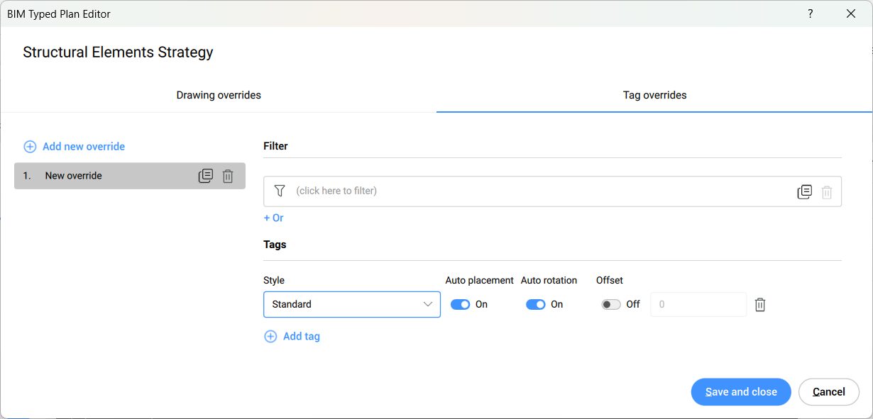 O primeiro passo no template leva você à definição das substituições, onde você pode criar substituições para alterar as propriedades da entidade para personalizar a Planta Tipada e adicionar filtros. Um novo elemento de substituição é adicionado à lista ao clicar o botão Criar nova substituição se nenhuma substituição estiver criada, ou Adicionar nova substituição no topo da lista de substituições.