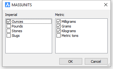 - Especifique as unidades de massa desejadas, na caixa de diálogo MASSUNITS. Nota: A configuração Unidades de massa afeta apenas os valores de massa. Outras propriedades de massa, como densidade ou momentos de inércia, serão formatadas em unidades SI para o sistema métrico e em unidades imperiais para o sistema imperial, independentemente do valor da configuração de Unidades de massa.