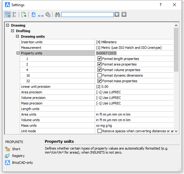 - Expanda as configurações Unidades de propriedade em Desenho > Desenho > Unidades do desenho.