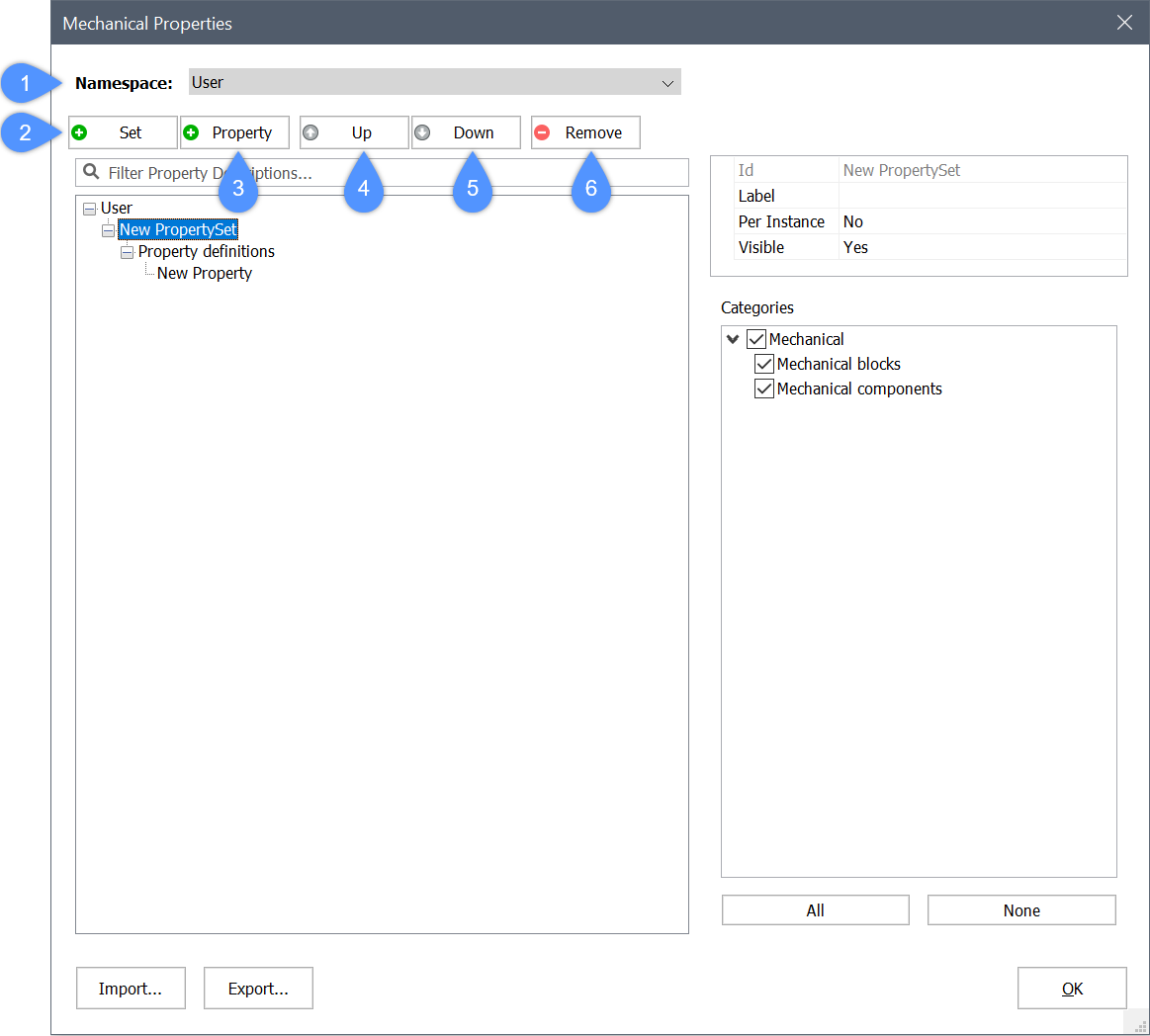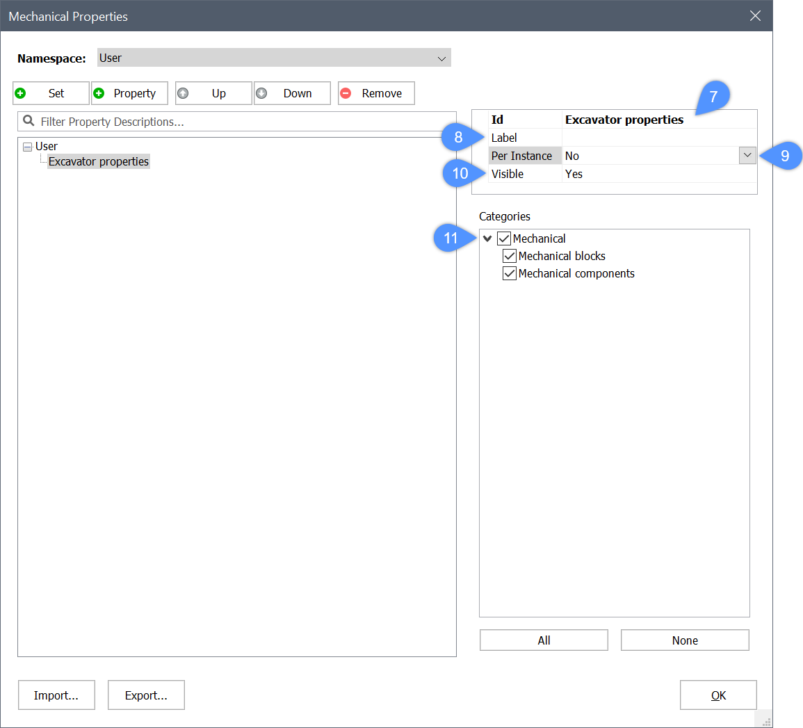 - Por instância: (9) permite Ativar/Desativar propriedades definidas-pelo-usuário, por entidade.Para atribuir um conjunto de propriedades por-instância a um componente raiz, faça o seguinte: