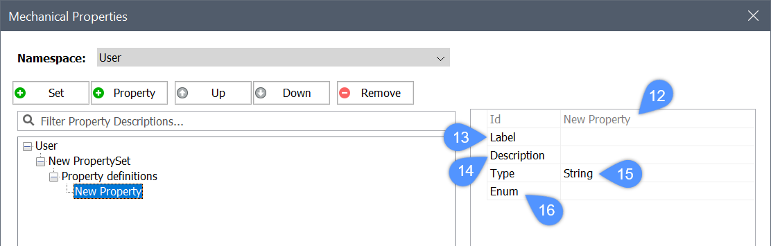 - Você pode definir valores enumerados (16). Permite a você definir um número fixo de possíveis valores para propriedades personalizadas. Esses valores podem ser selecionados em uma lista suspensa no painel Propriedades ou Propriedades do componente no Navegador de Mecânica.