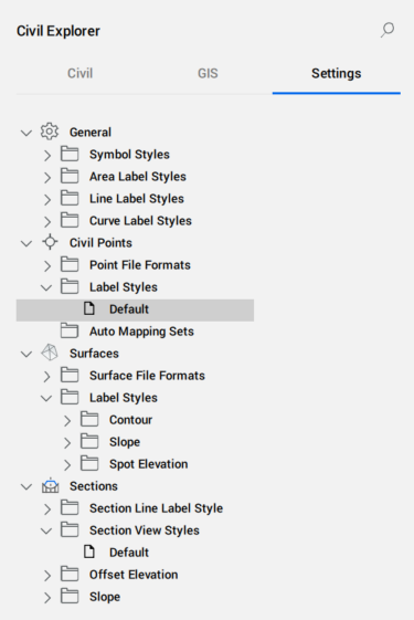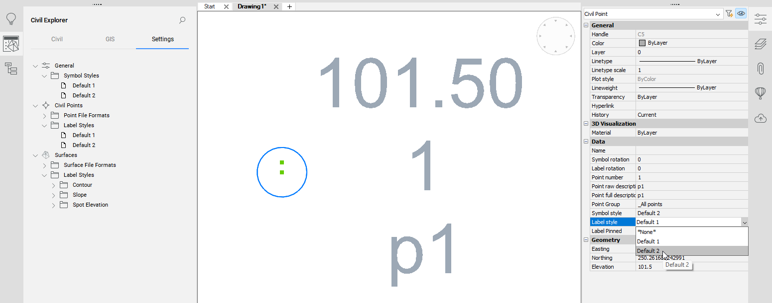 Você pode atribuir um estilo exclusivo de rótulo e de símbolo, a cada ponto de Civil em um desenho. O Estilo de Rótulo do Ponto de Civil e o Estilo de Símbolo do Ponto de Civil são especificados nas propriedades. Você pode definir o Estilo do Rótulo e do Símbolo na aba Configurações do painel Explorer de Civil.