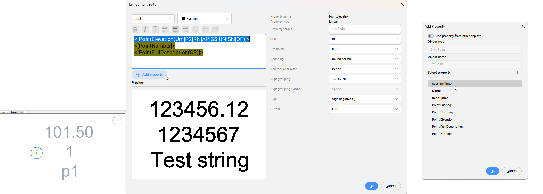 O processo de criação de novos atributos definidos pelo usuário para pontos de Civil é descrito no artigo Criar atributos definidos-pelo-usuário para pontos de Civil. O conteúdo das caixas de diálogo Editor Conteúdo do Texto e Adic. propriedade é descrito nos artigos da caixa de diálogo Editor Conteúdo do Texto e caixa de diálogo Adic. propriedade.