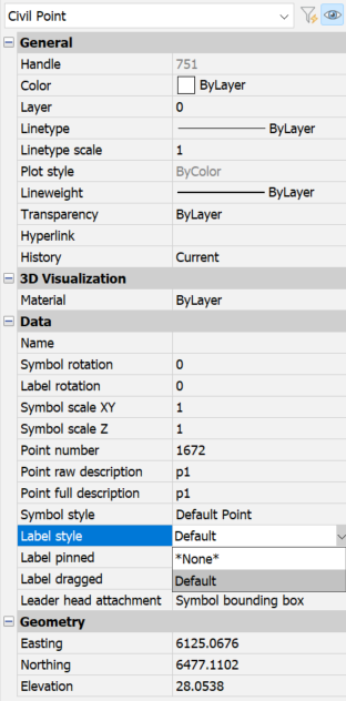 Para cada ponto ou grupo de pontos, você pode selecionar o estilo de símbolo ou de rótulo apropriado, a partir das listas suspensas Estilo de Símbolo e Estilo de Rótulo. Você pode definir o ponto de Civil para que este não contenha rótulos ou símbolos. Você pode fazer isso selecionando a opção Nenhum, na lista suspensa das propriedades de estilo de Símbolos e Rótulos.