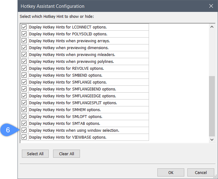 Certifique-se de que as opções de Dica de Tecla de Atalho estejam habilitadas para os comandos desejados (6).