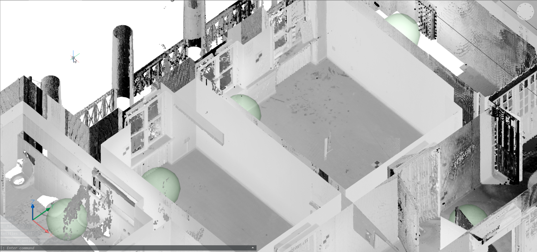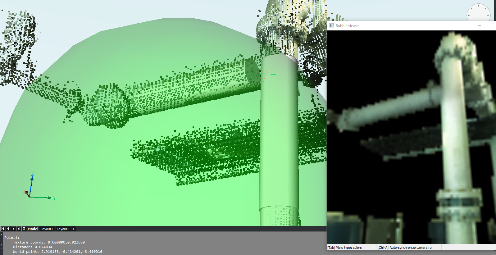 - Você também pode usar esse comando no Model Space quando o Visualizador de Bolha não está aberto. BricsCAD® solicita que você selecione um ponto da Nuvem de pontos no Model Space. Dependendo do tamanho das partes visíveis da Nuvem de pontos, isto pode levar mais tempo em comparação com a execução do comando dentro do Visualizador de Bolha. No entanto, tem duas vantagens ao pesquisar em múltiplas posições de varredura: