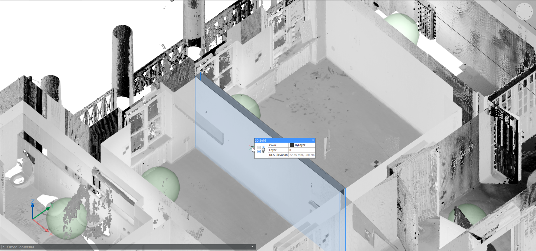 O novo comando NUVEMPONTOSAJUSTARPLANO permite a você criar geometria 3D com base na Nuvem de pontos. Esta vai criar uma superfície planar ou sólida, após selecionar um ponto de origem (seed point) em uma Nuvem de pontos. Para detectar os pontos que se encontram no mesmo plano que o ponto de origem (seed point), é utilizado um valor de limiar que pode ser definido como uma propriedade da entidade Nuvem de pontos. Mantendo pressionado o botão Shift e selecionando as paredes adjacentes de uma sala, os planos ajustados serão estendidos/aparados para formar uma superfície fechada.