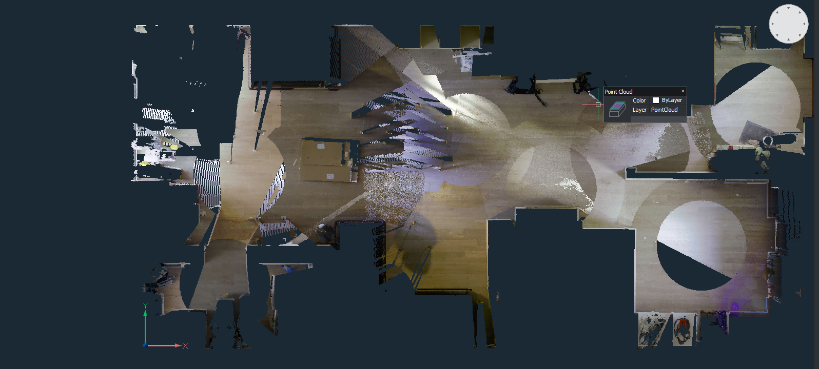 O comando NUVEMPONTOSALINHAR faz rotacionar automaticamente uma nuvem de pontos, para alinhá-la de forma ideal com os eixos X e Y, levando em conta as superfícies planas verticais na nuvem de pontos (ex., paredes). Para determinar o melhor alinhamento, você é solicitado a especificar a área mais relevante da Nuvem de pontos que contém paredes.