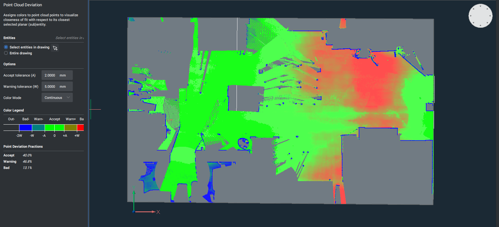 As distâncias dos pontos do chão até o plano ajustado são visualizadas usando um mapa de cores. No painel à esquerda, uma explicação das cores é fornecida (aqui o verde é o plano, o gradiente de verde para azul está acima do plano, e o gradiente de verde para vermelho está abaixo do plano). Além disso, um resumo das percentagens de pontos em que a categoria é apresentada (OK, nível de aviso,...)
