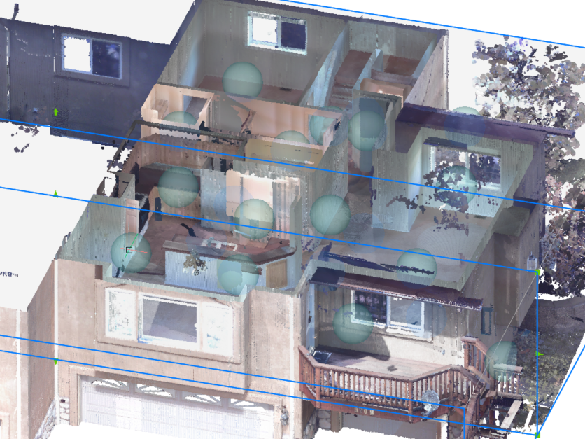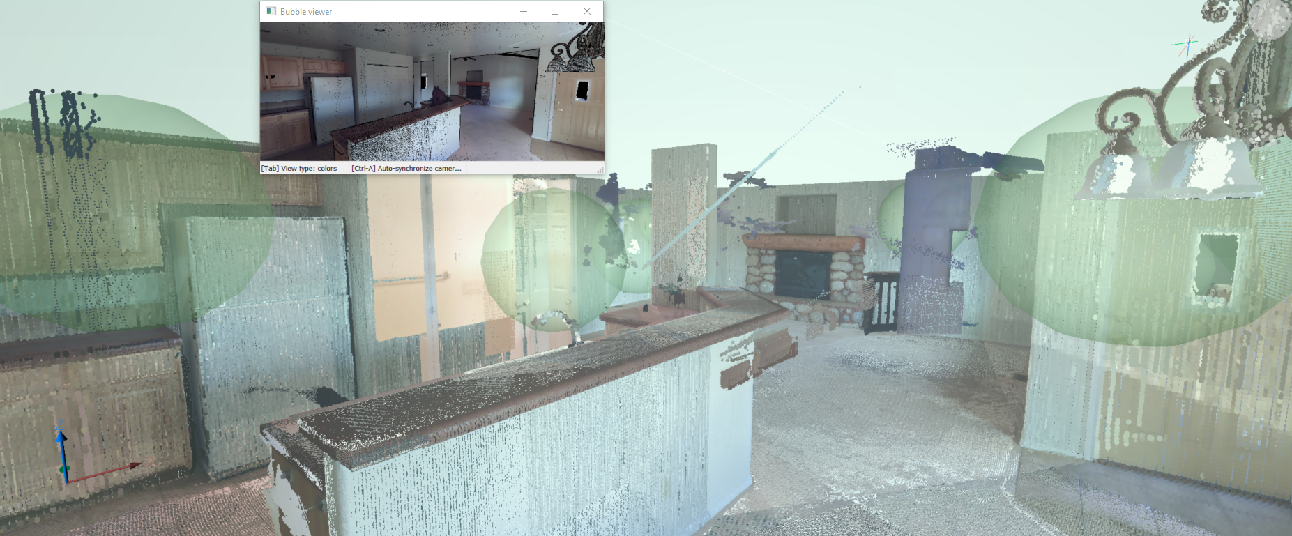 Dependendo do formato de arquivo original da Nuvem de pontos e do tipo de scanner usado durante a varredura (estática ou cinemática), as bolhas (esferas verdes) ou waypoints (esferas azuis) podem ser mostrados em todos os locais da digitalização. Nesses locais, você vai experimentar as representações visuais mais realistas, abrindo o Visualizador de Bolha.