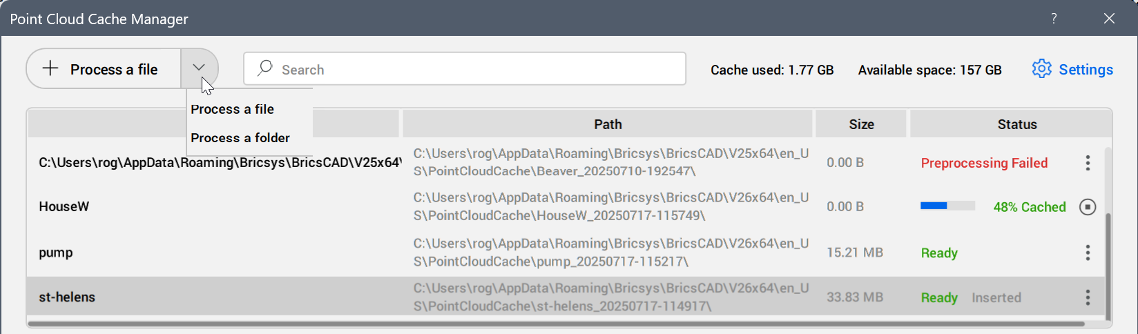 - Qualquer subpasta com dados de cache de Nuvem de pontos previamente pré-processados (de outra pasta de cache de Nuvem de pontos do BricsCAD® ou pré-processada com o executável em shell, preprocessor.exe) podem ser copiados para a pasta especificada pela variável de sistema POINTCLOUDCACHEFOLDER (valor padrão: C:\Users\%username%\AppData\Roaming\Bricsys\BricsCAD\V26x64\pt_BR\PointCloudCache). Os arquivos de cache estarão disponíveis na próxima vez que você abrir a caixa de diálogo Gerenciador Cache Nuvem de pontos. Para cada subpasta na pasta de cache da Nuvem de pontos, há um item na caixa de diálogo Gerenciador Cache Nuvem de pontos.