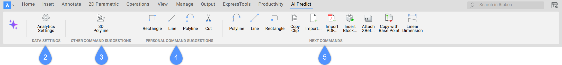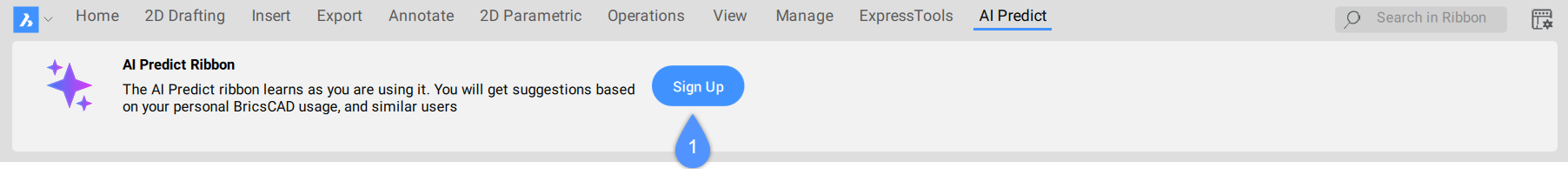 A Faixa de opções IA Prever fornece sugestões com base em seu uso pessoal do BricsCAD®, e usuários similares. A aba IA Prever tem dois estados: um estado vazio e um estado preenchido.
