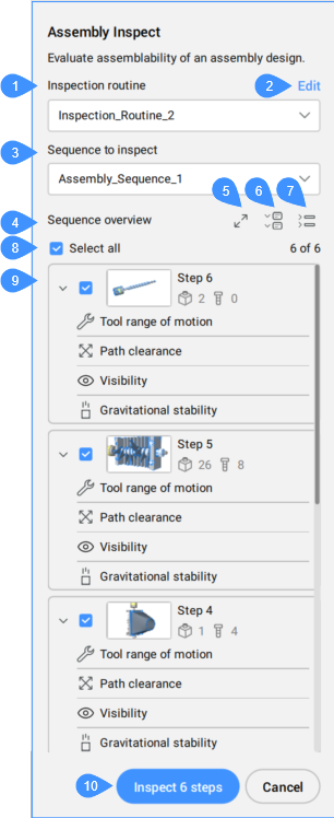 Você pode executar a inspeção de montagem selecionando uma opção na linha de Comando.