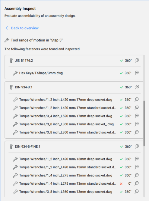 No painel de resultados detalhado do critério Amplitude de movimento da ferramenta, cada ferramenta aplicável é listada com sua faixa angular para cada fixador listado. A maior faixa angular de todas as ferramentas aplicáveis a esse fixador define a área angular de um fixador.