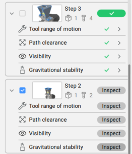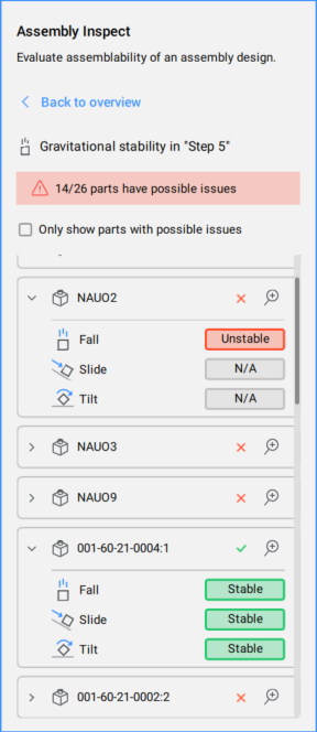- Nenhuma peça no critério de Estabilidade gravitacional quando a opção “ignorar fixadores” está ativada.
