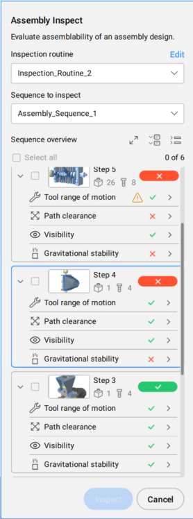 Ao pressionar o botão Inspecionar, você pode executar a avaliação de uma etapa inteira, ou de cada critério da rotina usada.