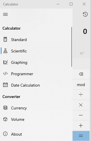 Tem 2 categorias para escolher: Calculadora (Padrão, Científica, Gráfica, Programador, Cálculo de Data) e Conversor (Moeda, Volume, Comprimento, Peso e Massa, Temperatura, Energia, Area, Velocidade, Tempo, Potência, Dados, Pressão, Angulo).