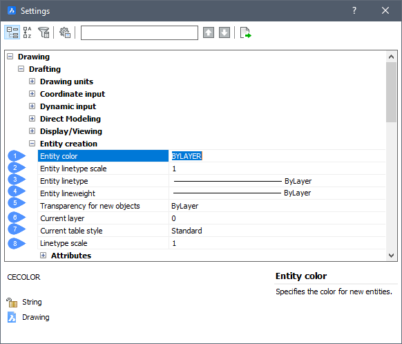 - Especifica a cor do padrão de novas entidades; o padrão é PorCamada, o que significa que as cores da entidade são regidas por propriedades da camada.