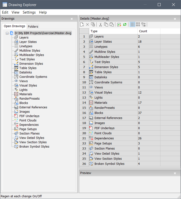 Abre a caixa de diálogo Explorer do Desenho na última aba ou categoria usada, para gerenciar definições e conteúdo de referência que foi usado no desenho.