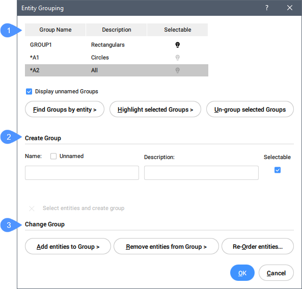 A caixa de diálogo Agrupar Entidades permite visualizar, criar, modificar e excluir grupos nomeados de entidades no desenho atual.